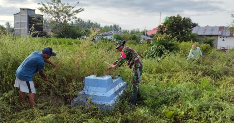 PASANGKAYU - Babinsa Koramil 1427-02/Bambalamotu, Sertu Amiruddin, bersama aparat desa dan warga melaksanakan kerja bakti pembersihan makam umum di Dusun Babana, Desa Pangiang, Kecamatan Bambalamotu, Kabupaten Pasangkayu. Kegiatan ini menjadi wujud nyata kepedulian TNI AD dalam menjaga kebersihan lingkungan sekaligus mempererat kebersamaan masyarakat.