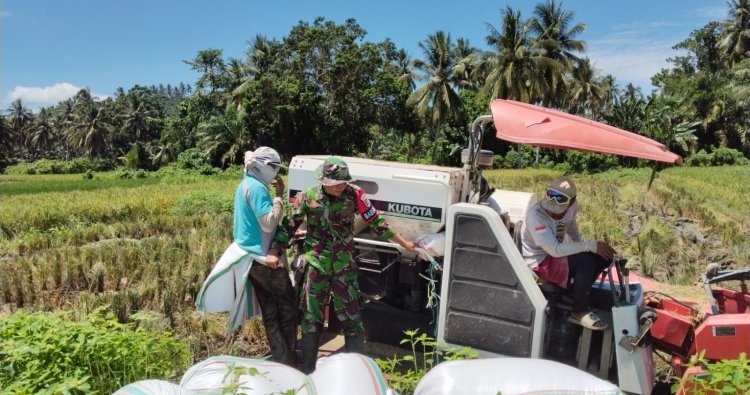 Turut hadir dalam kegiatan tersebut Rustam, operator mesin Combine Harvester, dan Adi, anggota kelompok tani. Kehadiran Babinsa di tengah masyarakat tidak hanya membantu kelancaran proses panen, tetapi juga memberikan motivasi bagi petani agar hasil produksi tetap optimal.